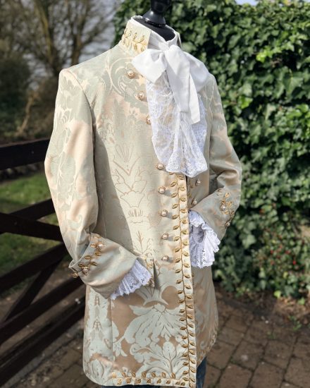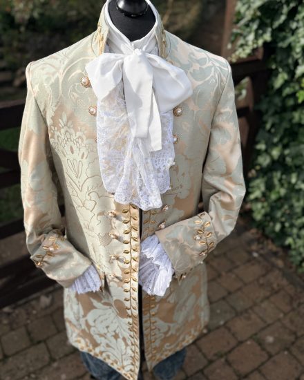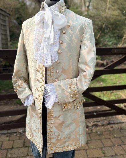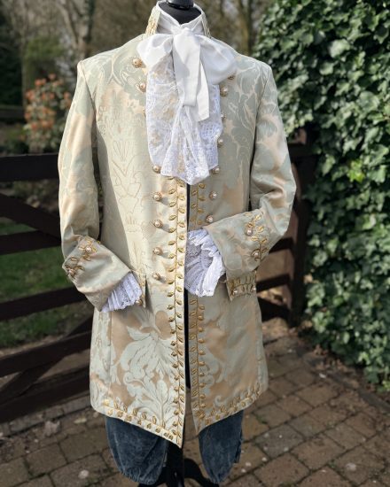 This beautiful costume includes: Georgian cut coat in eggshell blue & buff damask print, trimmed with gold leaf braid, blue velvet breeches, waistcoat front, period shirt, frilled neck stock, white hose & shoe Buckles.