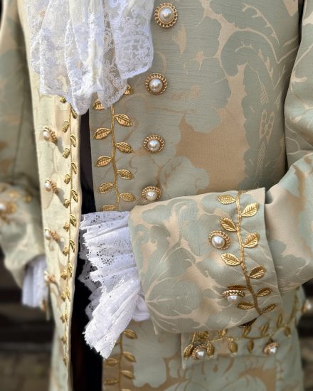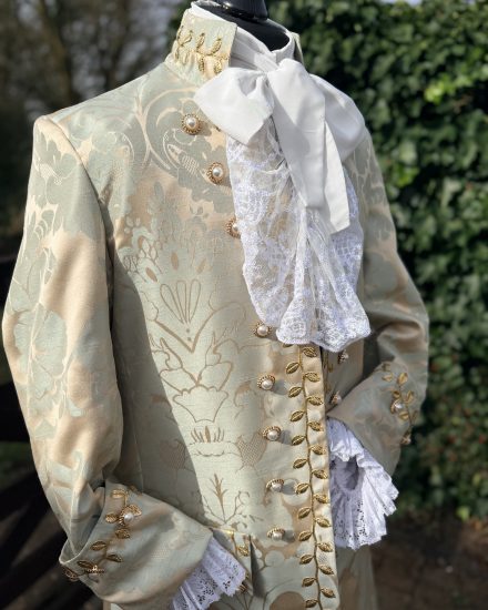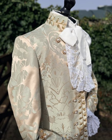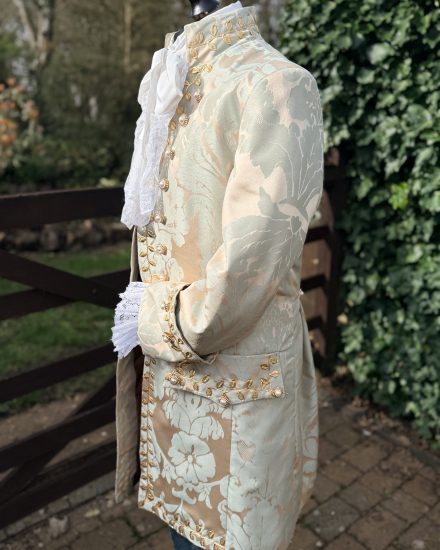 A stunning & sophisticated gents eggshell blue & buff damask Georgian suit. A perfect choice for any upmarket Georgian gent, Venetian Ball, Versailles, Prince Charming along with TV & Film Characters.