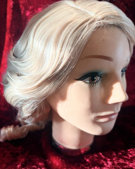 A beautiful elegant wig with side parting in a 2 tone blonde shade. Dressed with set ringlets and rolls to the back.