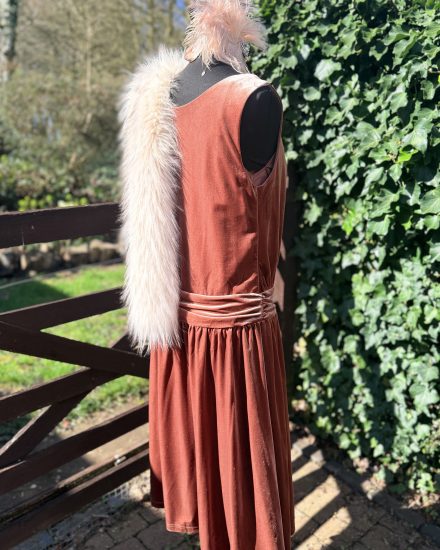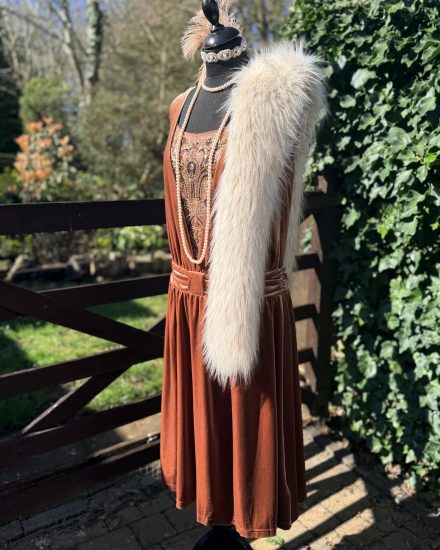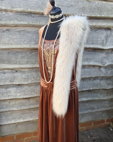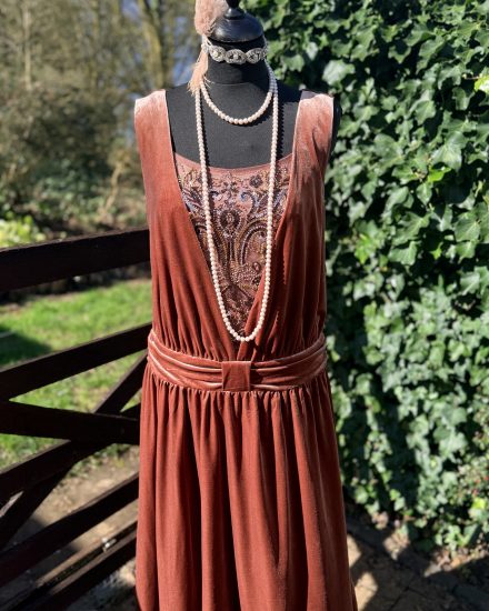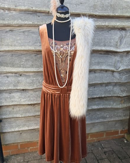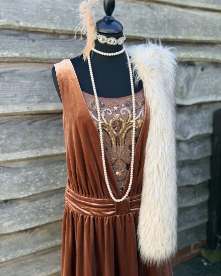 This stunning ladies pale coffee velvet 1920’s dress will be sure to turn heads. An exquisite dress in velvet with soft pale coffee tones with embellished front decoration and elegant 20’s style draping at the waistline.
