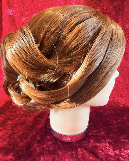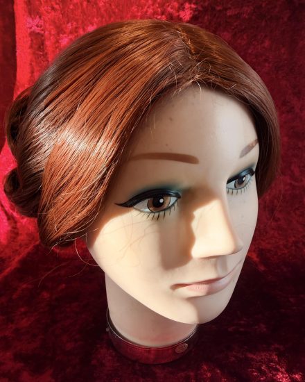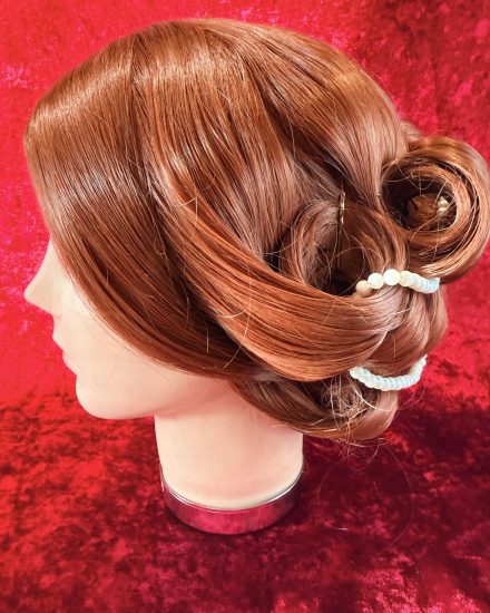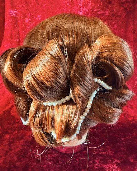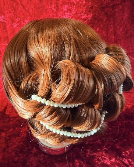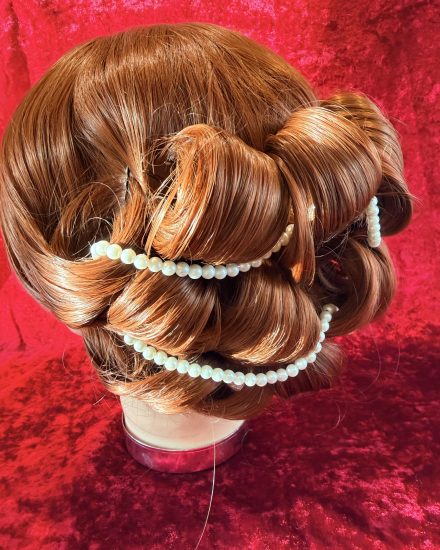 A beautiful elegant wig dressed with back rolls and ringlets to the back if you desire. Delicate pearls are swathed through the back rolls to add a touch of extra elegance and sophistication.